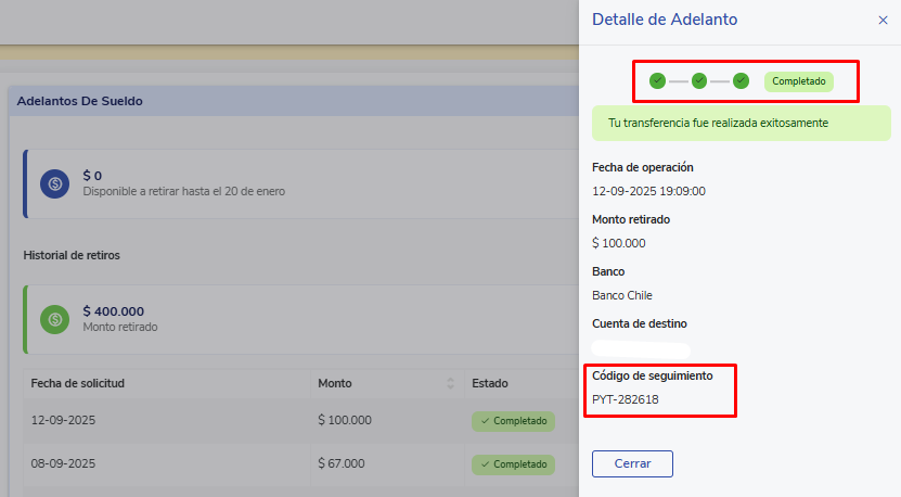 Al final de la página verás el historial de adelantos, con el estado de cada uno.