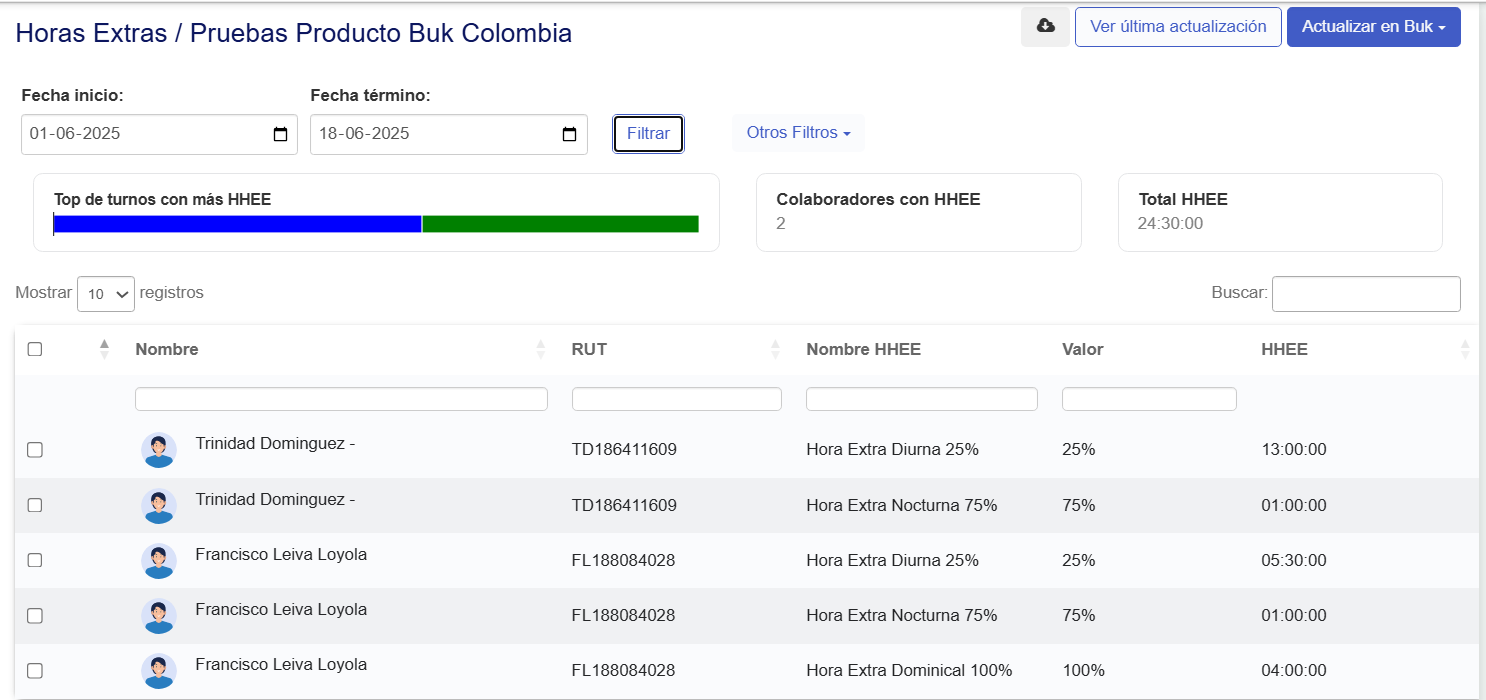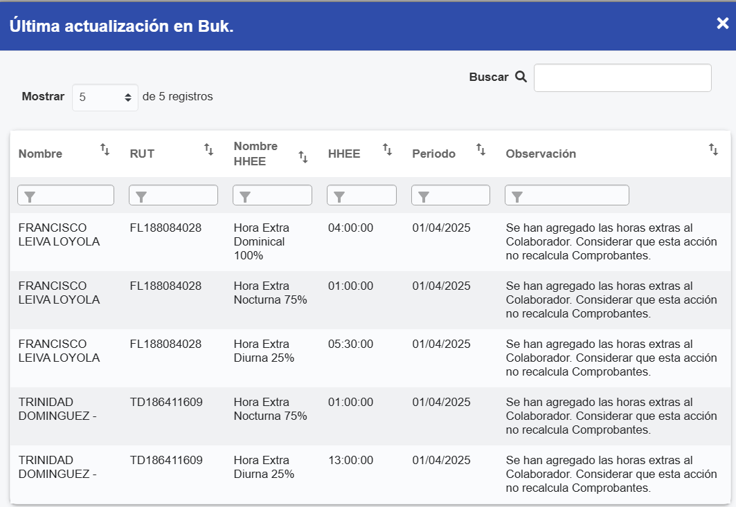 Luego de un envío exitoso podrás ver la información en la ficha de cada colaborador en el módulo de Remuneraciones. Las horas extras se reflejarán en la boleta de pago de cada colaborador, una vez que presiones el icono "Actualizar".