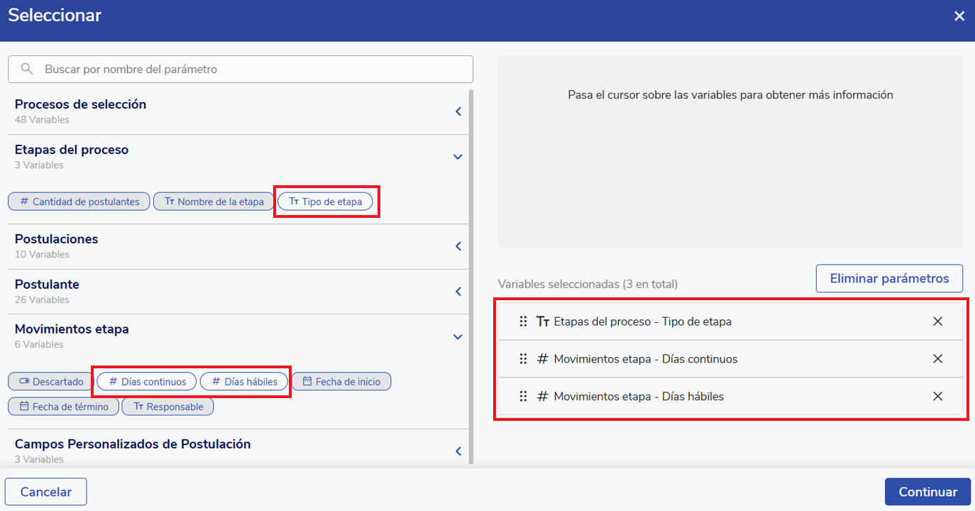 En la nueva vista, al hacer clic en “Seleccionar datos”, se abrirá una ventana con todos los parámetros disponibles, agrupados por procesos de selección, etapas del proceso, postulaciones, entre otros. De forma similar a los exportadores ya descritos, se pueden elegir los parámetros deseados, que irán apareciendo en el listado de la derecha. Una vez finalizada la selección, se debe hacer clic en “Continuar”.