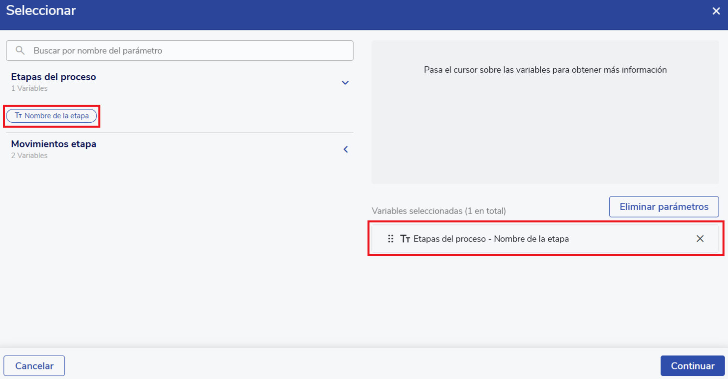 Se recomienda escoger la variable Tipo de etapa dependiendo de si se han etiquetado gran parte de las etapas del proceso.