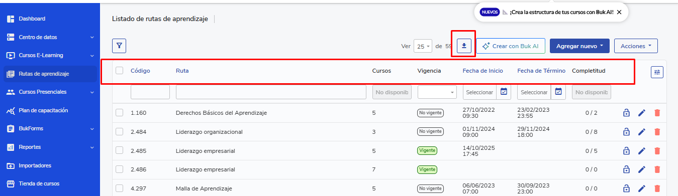 📘 Cursos: Muestra todos los cursos que forman parte de la ruta, incluyendo versiones anteriores si han existido cambios. Verás: