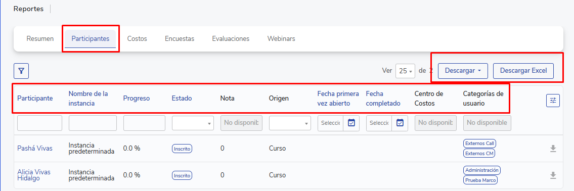 👥 Participantes: Lista a todos los colaboradores inscritos en la instancia, junto con::