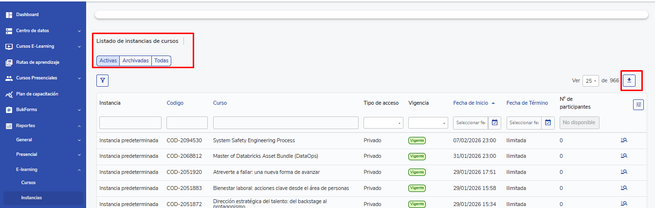 - A continuación, se mostrará el listado de todas las instancias de cursos e-learning. Por defecto, se mostrarán solo las instancias activas.