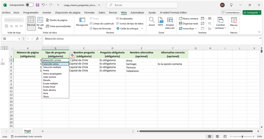 Si prefieres crear tu encuesta de forma más eficiente, puedes utilizar la función de carga masiva:
