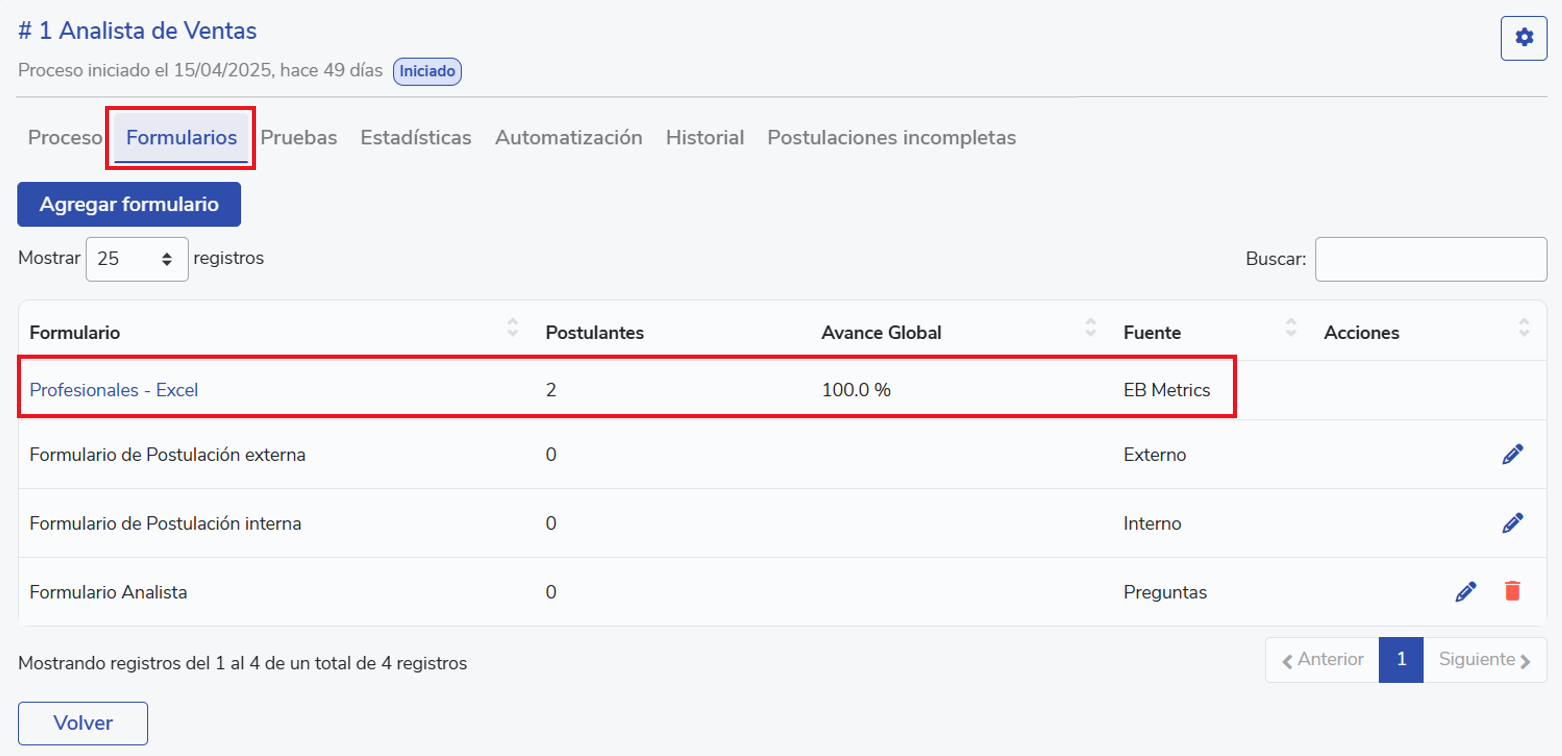 Puedes descargar estos informes desde la pestaña “Formularios” del proceso. Allí se listan las pruebas disponibles, el número de postulantes que las han completado, el avance general y la fuente de origen. Al hacer clic sobre un formulario de origen EB Metrics, podrás seleccionar a uno o más candidatos y usar la opción “Acciones” > “Descargar” para obtener los reportes.