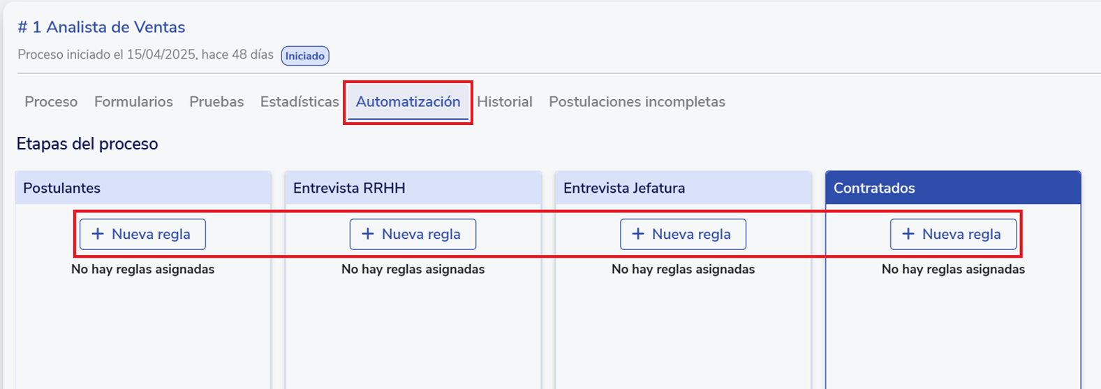 Para automatizar el envío de pruebas, entra al proceso de selección y ve a la pestaña “Automatización”. Selecciona la etapa correspondiente y haz clic en “+ Nueva regla”.