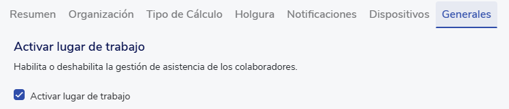 En la pestaña Generales, activa la opción Lugar de Trabajo. Esta acción inicia el control de asistencia para ese recinto.