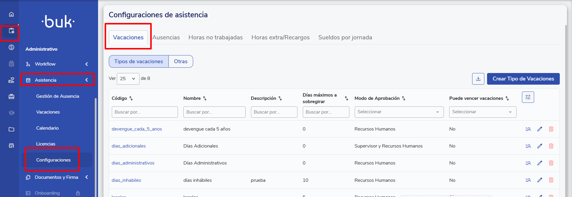 Ve a Administrativo > Asistencia > Configuraciones > Vacaciones.