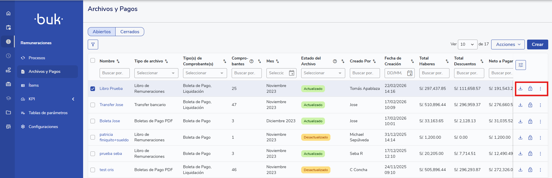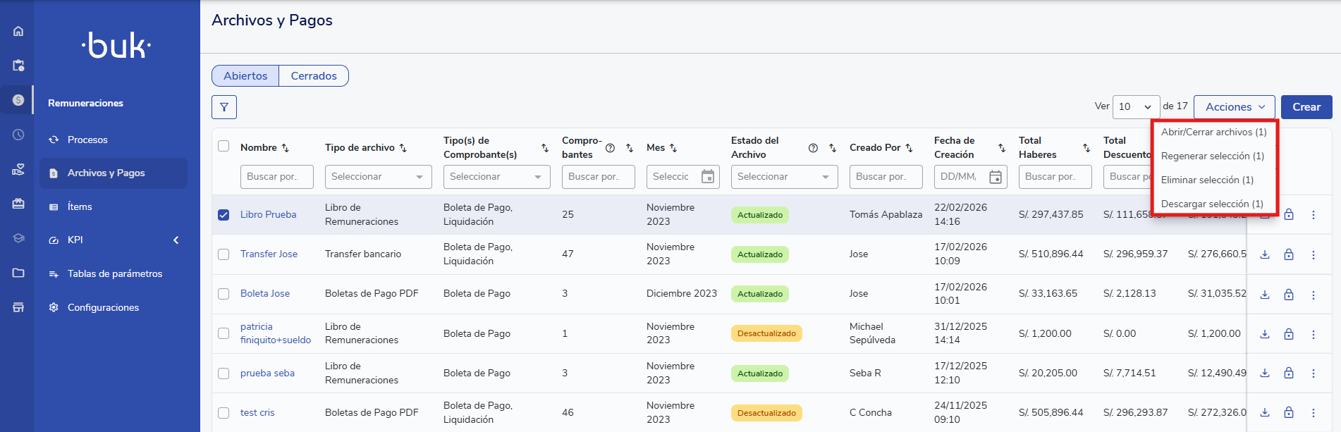 En Remuneración > Archivos y Pagos > Abiertos verás una tabla con las agrupaciones creadas. Cada fila incluye: