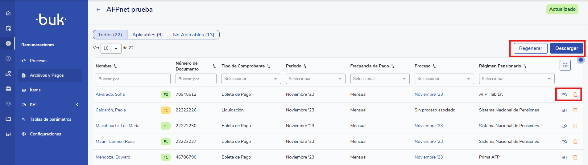 - A continuación se desplegará una vista con todos los comprobantes generados en el archivo. En la parte superior encontrarás una sección de Aplicables y No aplicables, donde podrás revisar en detalle cuáles comprobantes fueron considerados dentro del archivo, específicamente aquellos que corresponden a una AFP privada.