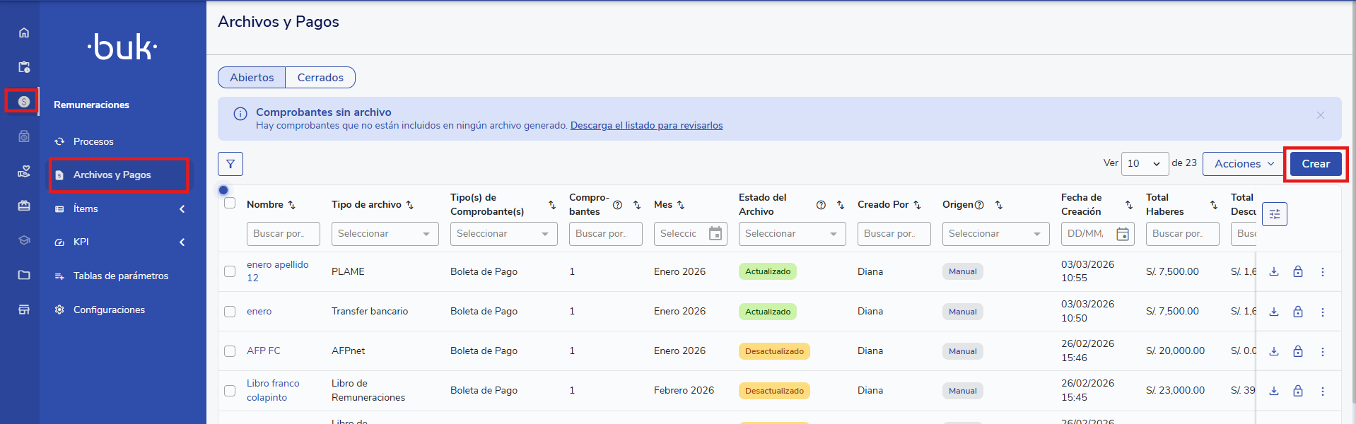 - Si no hay colaboradores cesados, el proceso funciona igual que siempre. Dirígete a la ruta: Remuneraciones > Archivos y Pagos > Crear. Luego elige el tipo de archivo a crear, en este caso, el archivo tipo Transfer Bancario, luego crea el grupo de colaboradores a los cuales quieres descargar el transfer, guardalo y descárgalo desde el ícono de la flecha.