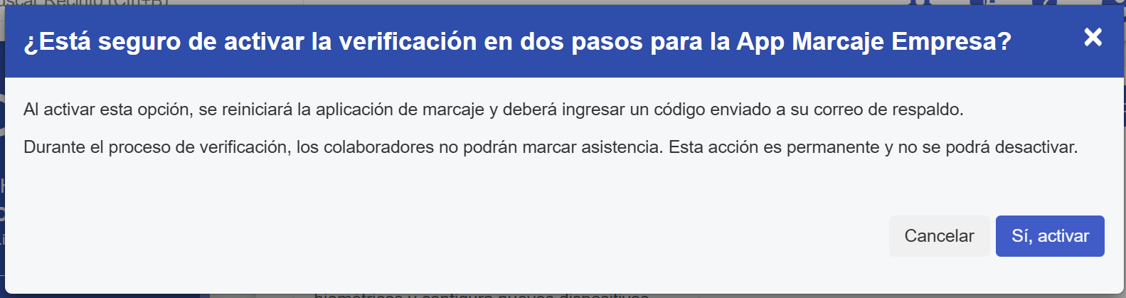 Al activar la opción 'Verificación en dos pasos para la APP Marcaje Empresa', se mostrará una ventana de confirmación para que revises y confirmes el proceso.