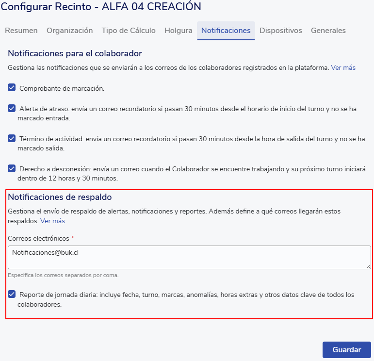 Si cuentas con la configuración de recintos desde el módulo de Control de Asistencia, debes asegurarte a qué correo se enviará el código, en la sección Notificaciones dentro de la Configuración del Recinto.