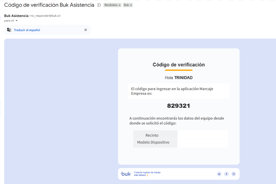 Para verificar tu acceso, enviamos un código de seguridad al correo registrado en Alertas y Notificaciones de tu configuración de recintos. Si gestionas estos ajustes desde Buk, revisa la pestaña Notificaciones para confirmar a qué correo llegará el código.