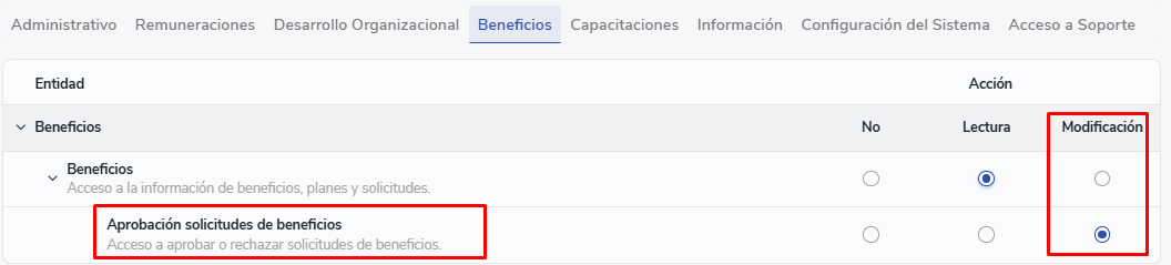 Podrán aprobar solicitudes los usuarios con permisos de Modificación de Beneficios.