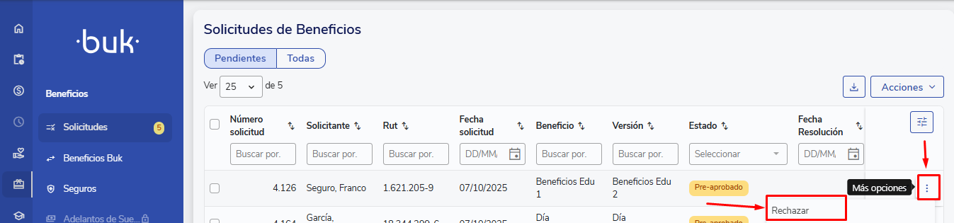 Además de aprobar, los usuarios con perfil de Administrador de beneficios pueden también rechazar o eliminar solicitudes.
