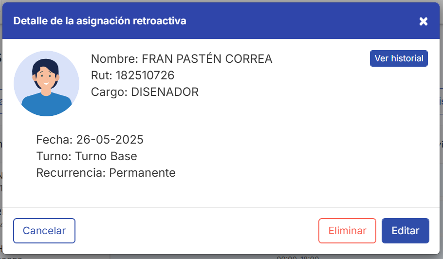 Para conocer el proceso masivo para el proceso de modificación de turnos retroactivos puedes revisar el siguiente artículo.