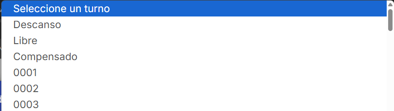 Este modal nos permitirá seleccionar un turno y contar con la opción de agregar día de Descanso, Libre o Compensado.