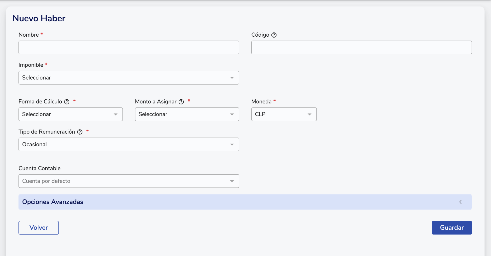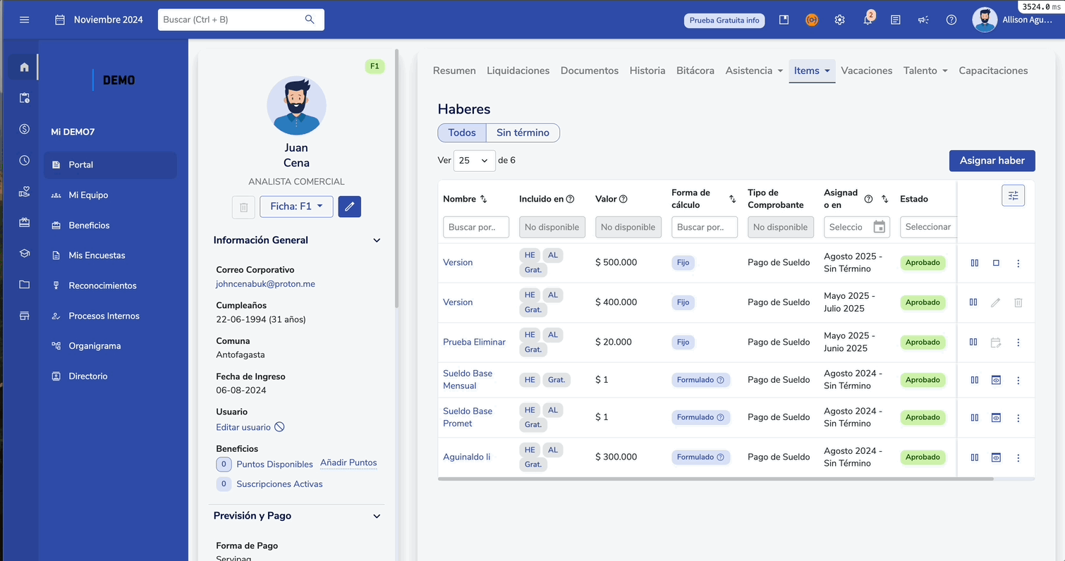 Todos los tipos de ítems (Haberes, Descuentos, Aportes, etc.) aparecen en un solo menú.