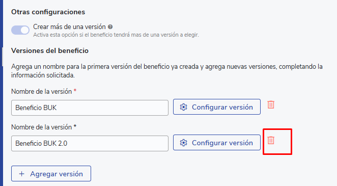Si ya configuraste la nueva versión debes guardar el beneficio para que esta se cree. Si quisieras eliminar una versión existente debes hacer click en el basurero con la versión que quieres eliminar seleccionada en el selector. Luego debes guardar los cambios para que esta se elimine.