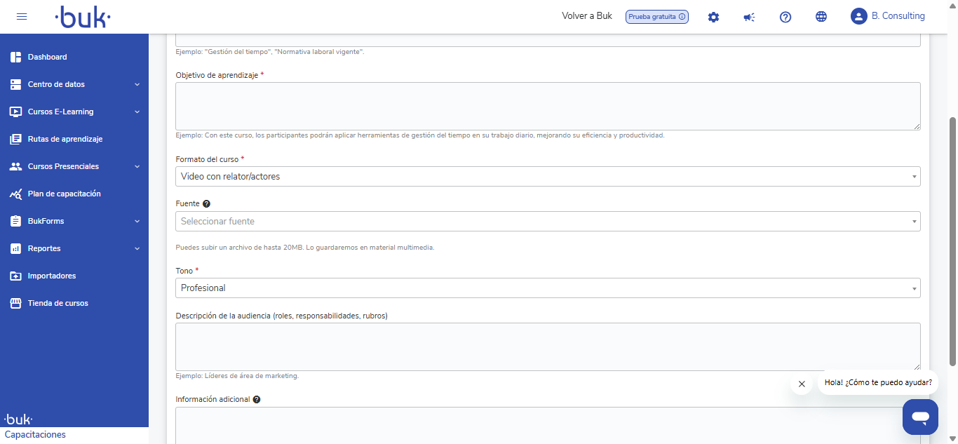 Formato del curso: (video con relator/actores o video animado): Define el medio visual y narrativo de entrega. Buk AI adapta la estructura del guion (separando diálogos, escenas o instrucciones visuales) según si el contenido será presentado por personas reales o mediante recursos gráficos animados.