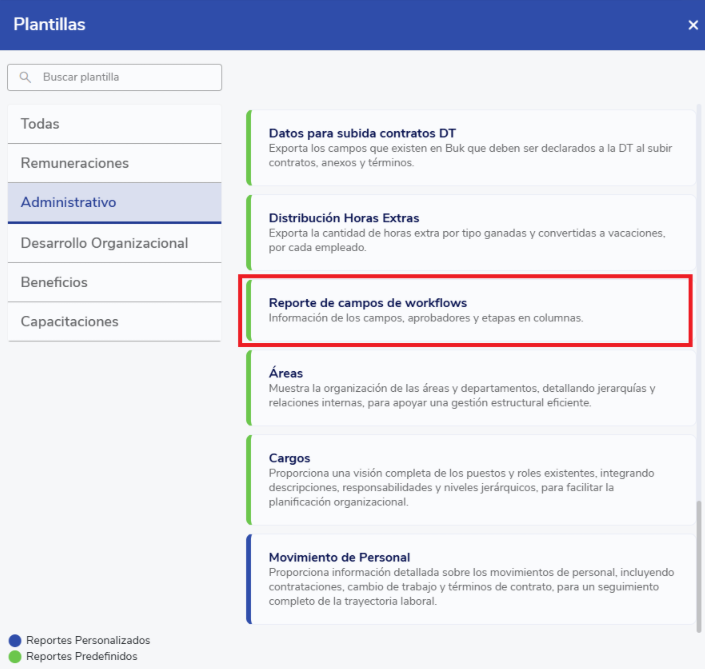 - Elegir el reporte predefinido (en verde) llamado Reporte de campos de workflows.