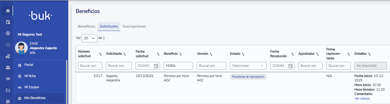 Por otro lado el Administrador de beneficios podrá visualizar las solicitudes que tiene pendientes de aprobar en la opción Beneficios >> Solicitudes, opción solo visible para usuarios con permisos de aprobación de beneficios: