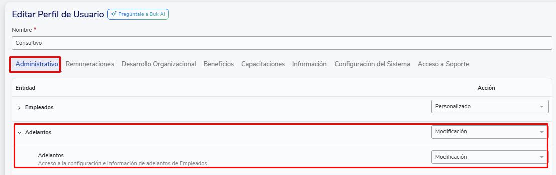Para empezar es muy importante que cuentes con los permisos asociados a tu usuario en el cual tengas activa la opción “Modificación” en Adelantos, caso contrario no podrás ver las configuraciones.