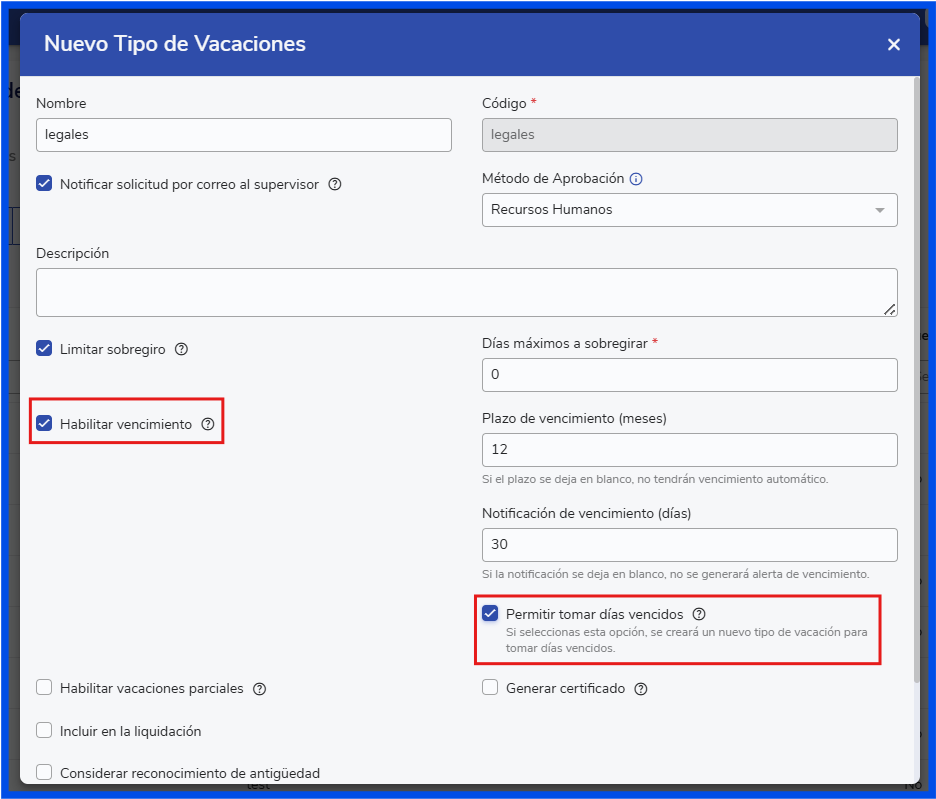 Al guardar, el sistema creará automáticamente un nuevo tipo de vacación con el mismo nombre que el original, pero con el sufijo "vencidas" (por ejemplo, "Legales vencidas").