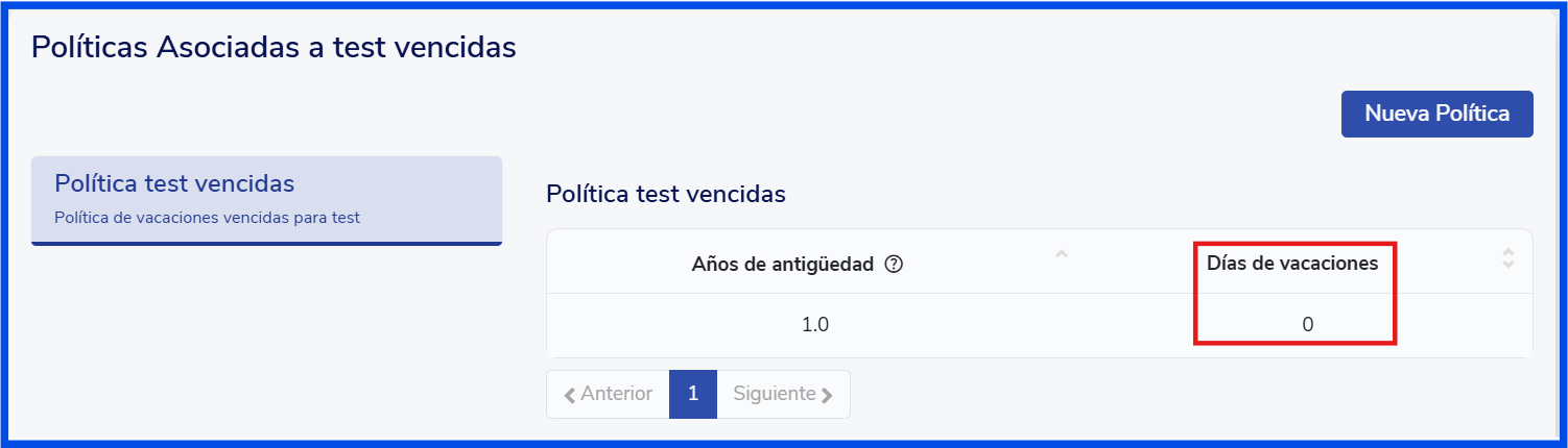 Además, el tipo de vacación con el sufijo "vencidas" no puede vencer nuevamente ni devengar días nuevos de vacaciones cumplido el año. Por lo tanto, a este tipo de vacación no se le pueden crear políticas de vacaciones adicionales a la que tiene por defecto.