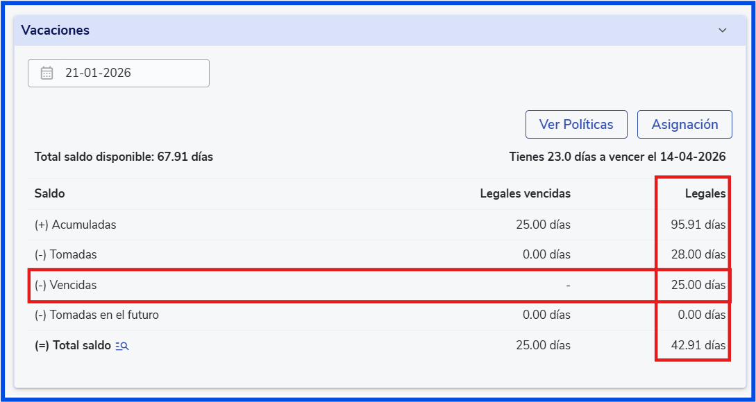 - El sistema descontará los días directamente del saldo del tipo de vacación vencida.