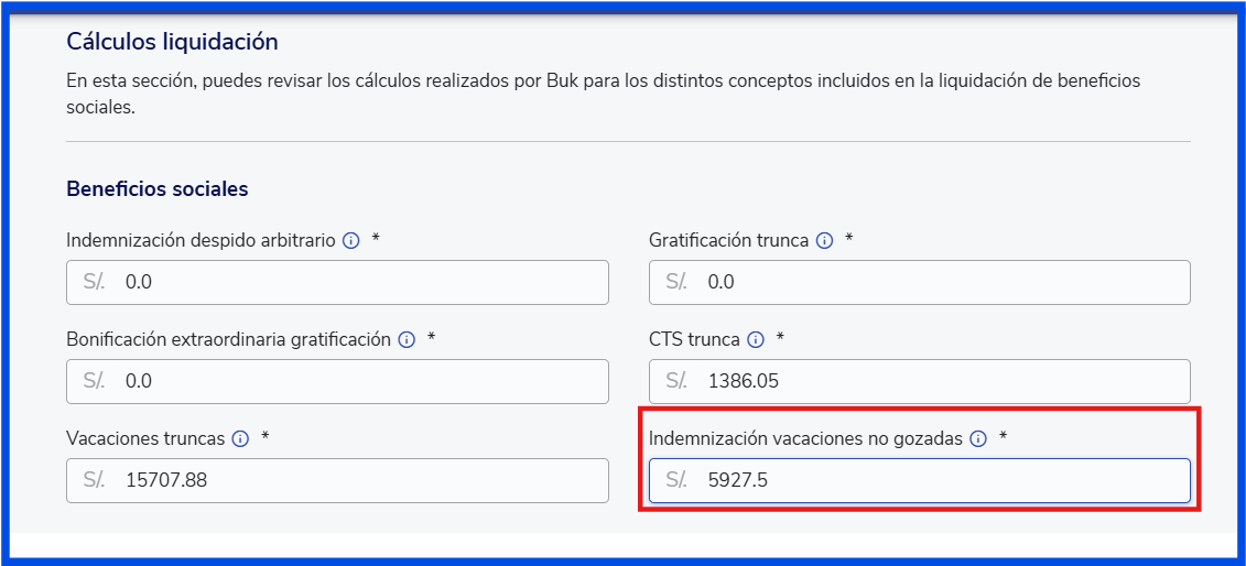 - Además, en la liquidación recibirá una indemnización por los días vencidos no gozados dentro del período correspondiente. En este caso, la indemnización sería de 273.1 soles por cada día vencido, sumando un total de 5,927.5 soles. Este cálculo puede previsualizarse en la simulación de liquidación, como se muestra en la imagen.