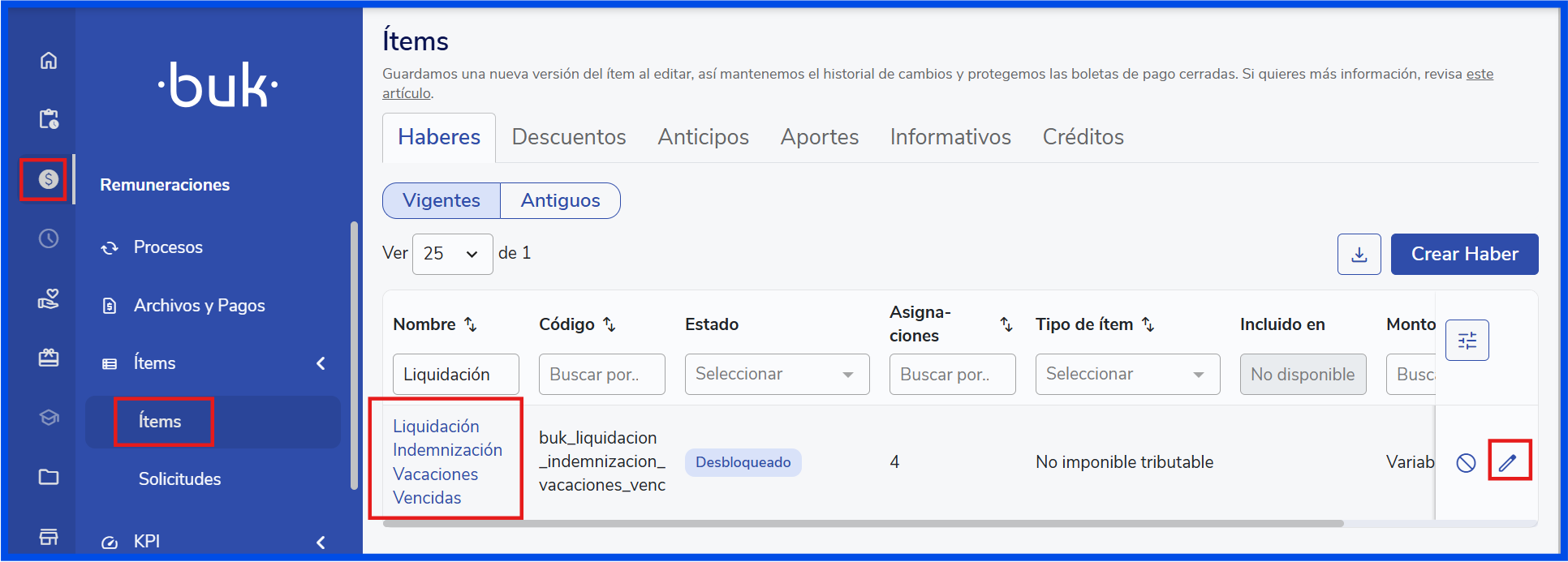 - Ve a Ítems > Haberes.