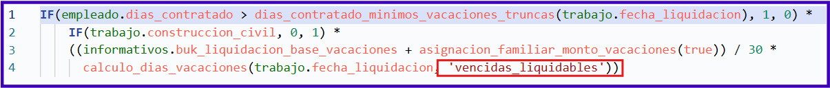 Con este cambio, el cálculo de la indemnización considerará únicamente los días vencidos que no fueron gozados. De igual manera, puedes editar las fórmulas de Provisión de Vacaciones Acumuladas y Liquidación Vacaciones Truncas, reemplazando la variable de 'vencidas' por 'vencidas_liquidables' en la función de calculo_dias_vacaciones para que considere solo los días vencidos no gozados, en lugar de todos los días vencidos.