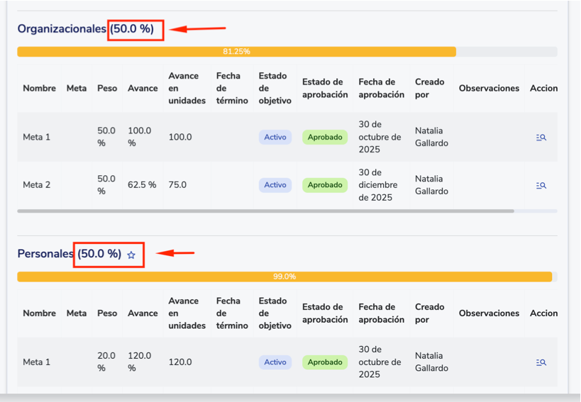 - Un colaborador obtiene en un objetivo un avance de un 100% y en otro supera la meta, alcanzando un 120%.
