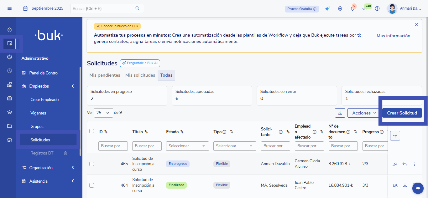 - Ve a Administrativo → Workflow → Solicitudes.