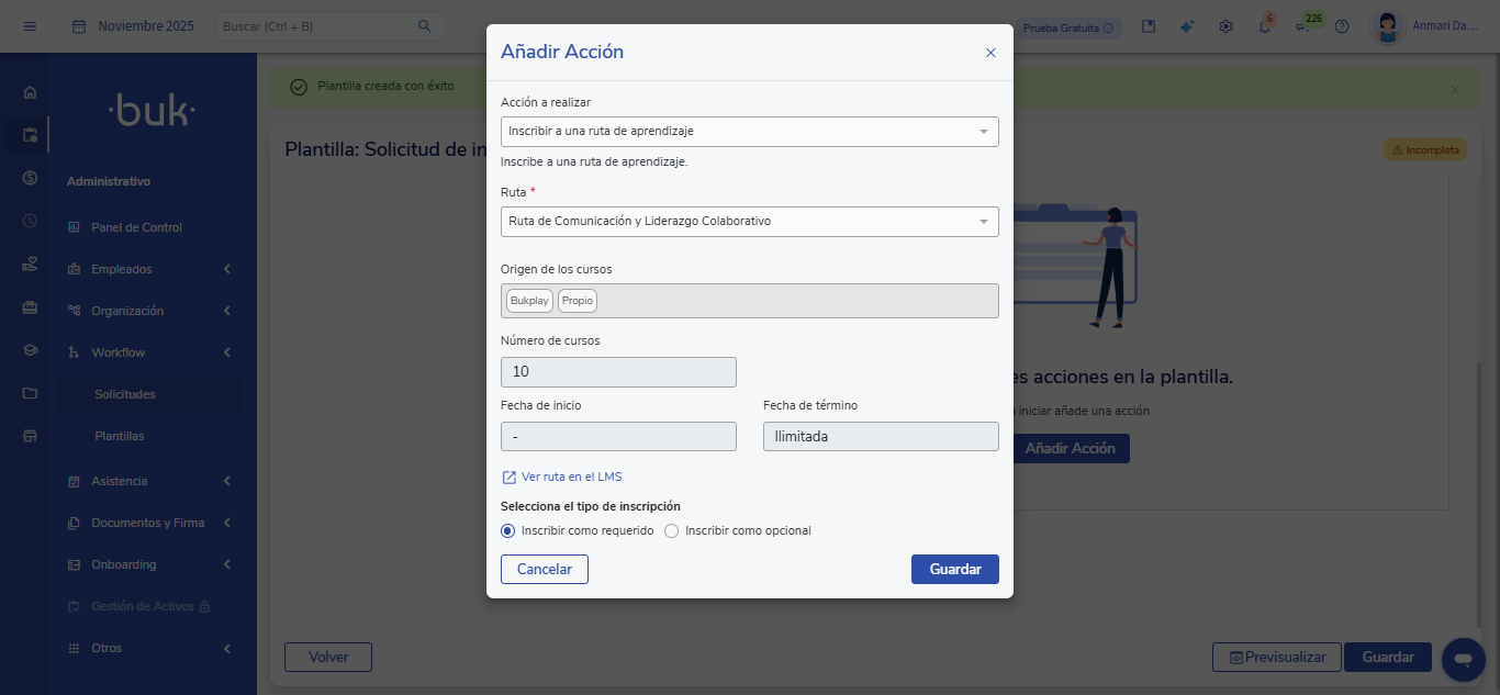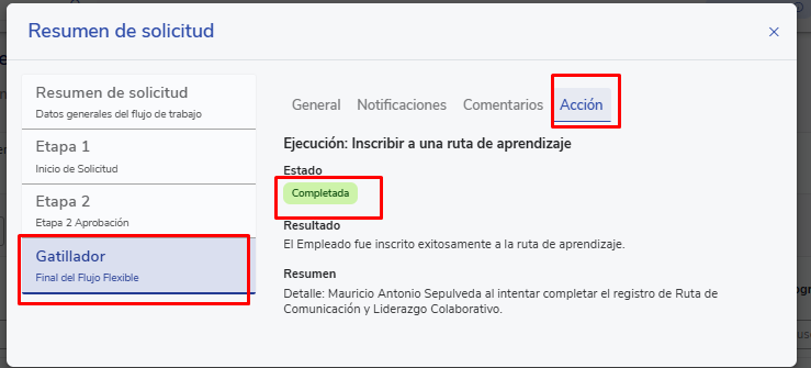 - Una vez aprobada, Workflow ejecuta la acción final “Inscribir a una ruta de aprendizaje”.
