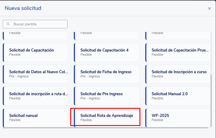 - Selecciona la plantilla creada Ejemplo: Solicitud de Inscripción a ruta de aprendizaje.