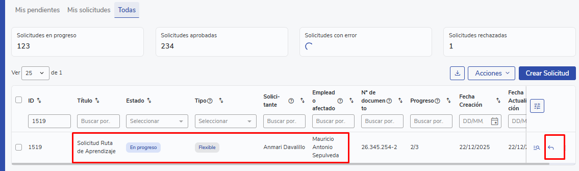 - Accede a Inicio → Mis solicitudes → Todos