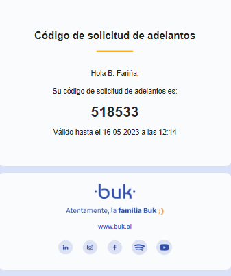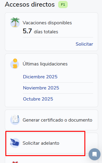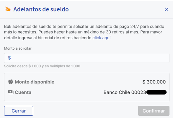 - Desde tu APP Buk: Accesos>>Solicitar Adelanto.