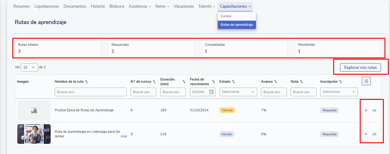 Además, para cada ruta podrás revisar: - Nombre de la ruta. - Número de cursos asociados. - Duración total. - Fecha de vencimiento, si aplica. - Estado de la ruta. - Porcentaje de avance.