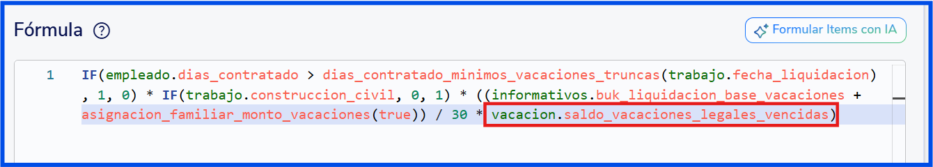 calculo_dias_vacaciones(trabajo.fecha_liquidacion, 'vencidas')porvacacion.saldo_vacaciones_legales_vencidas. - La fórmula del ítem quedará actualizada para considerar solo los días vencidos no gozados.
