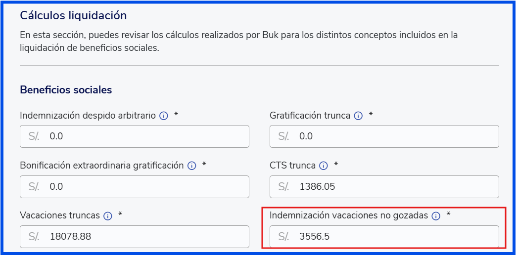 Con este cambio, el cálculo de la indemnización considerará únicamente los días vencidos que no fueron gozados. Podrás visualizar el monto calculado en la simulación de la liquidación de cada colaborador, dentro del campo llamado "Indemnización vacaciones no gozadas".