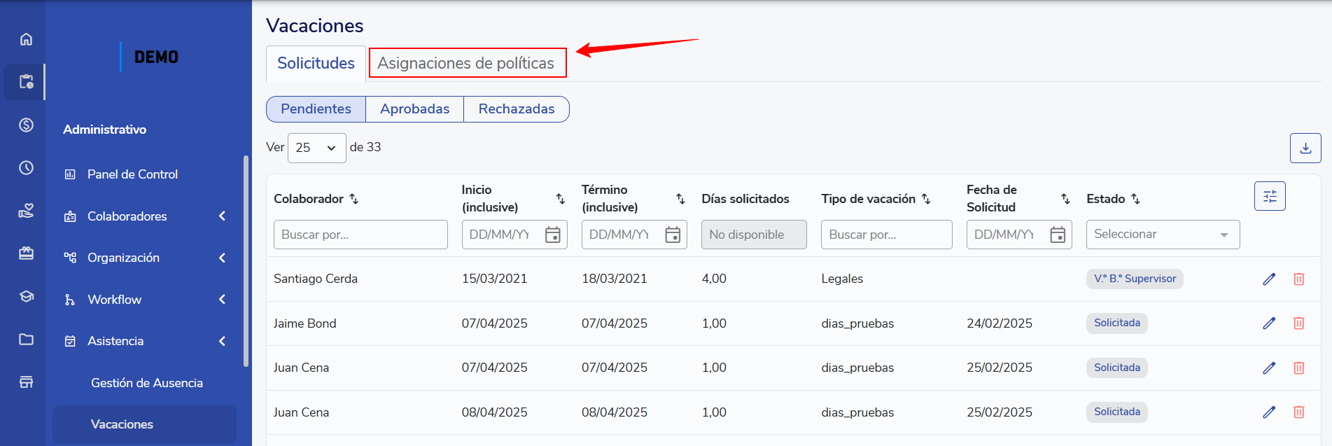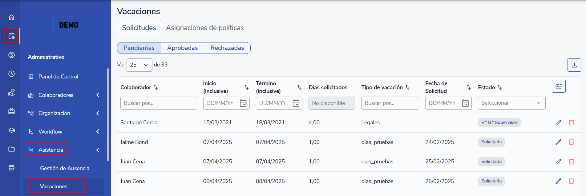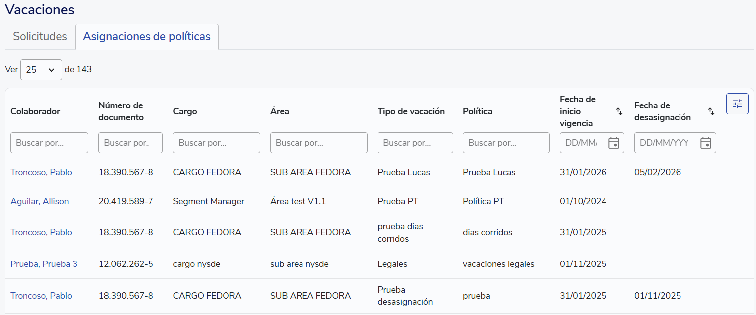 Vista Masiva de Registros y Solicitudes de Vacaciones