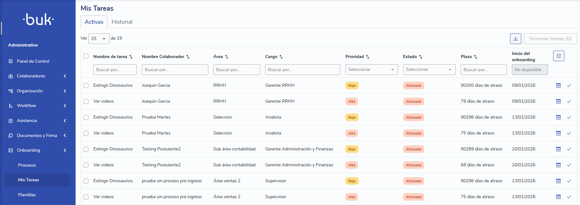 Las tareas son una de las piezas principales del módulo de Onboarding. Sirven para organizar las acciones que deben completarse durante la incorporación de una persona, asignarlas a quienes corresponda y dar seguimiento a su avance.