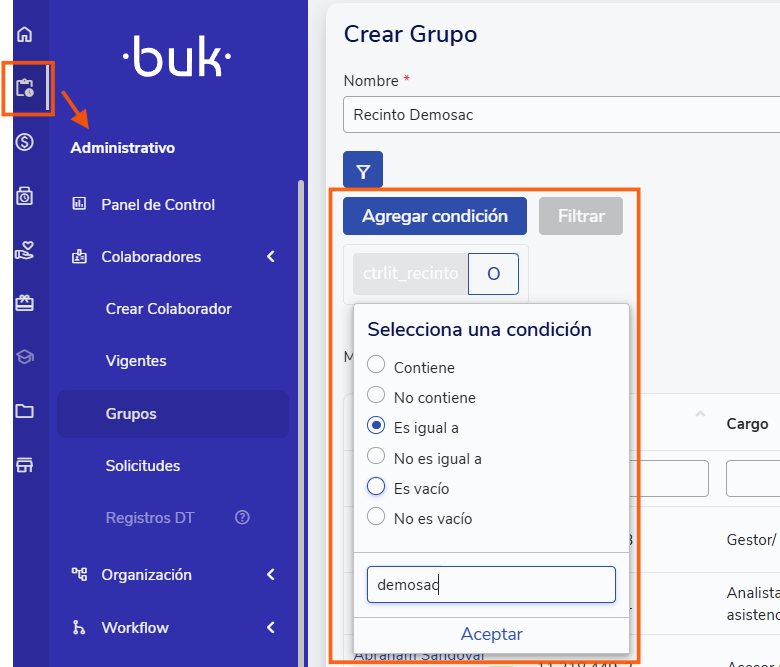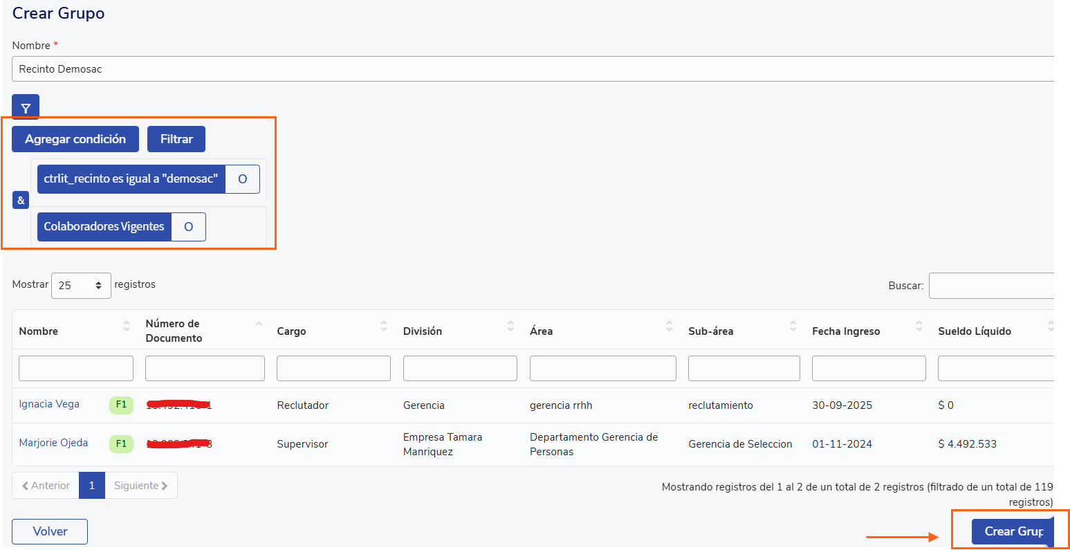 Para sincronizar ausencias, horas extras y horas no trabajadas de forma segmentada, debes crear grupos con condiciones específicas desde el módulo de Gestión de Personas.