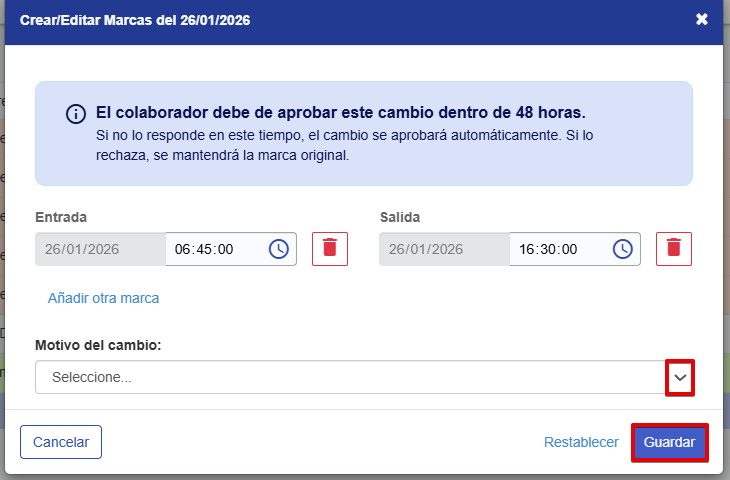 Aparecerá un cuadro donde debemos registrar la hora de la marca correspondiente dando clic en "Añadir otra marca" y eligiendo el motivo por el cual se está creando esa marca, finalmente clic en Guardar