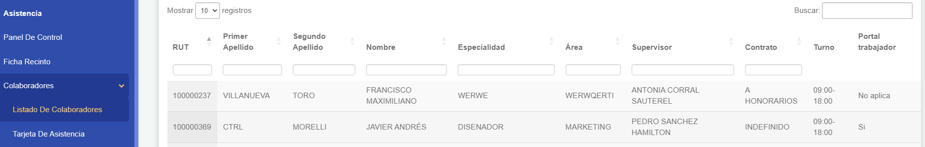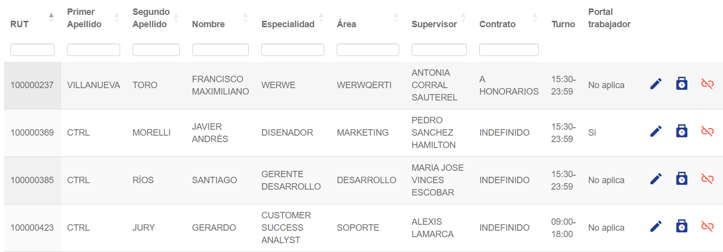 Esto traerá un listado con todos los colaboradores registrados en el lugar de trabajo, para que puedas buscar a través de los filtros, aquel que deseas otorgar el acceso.