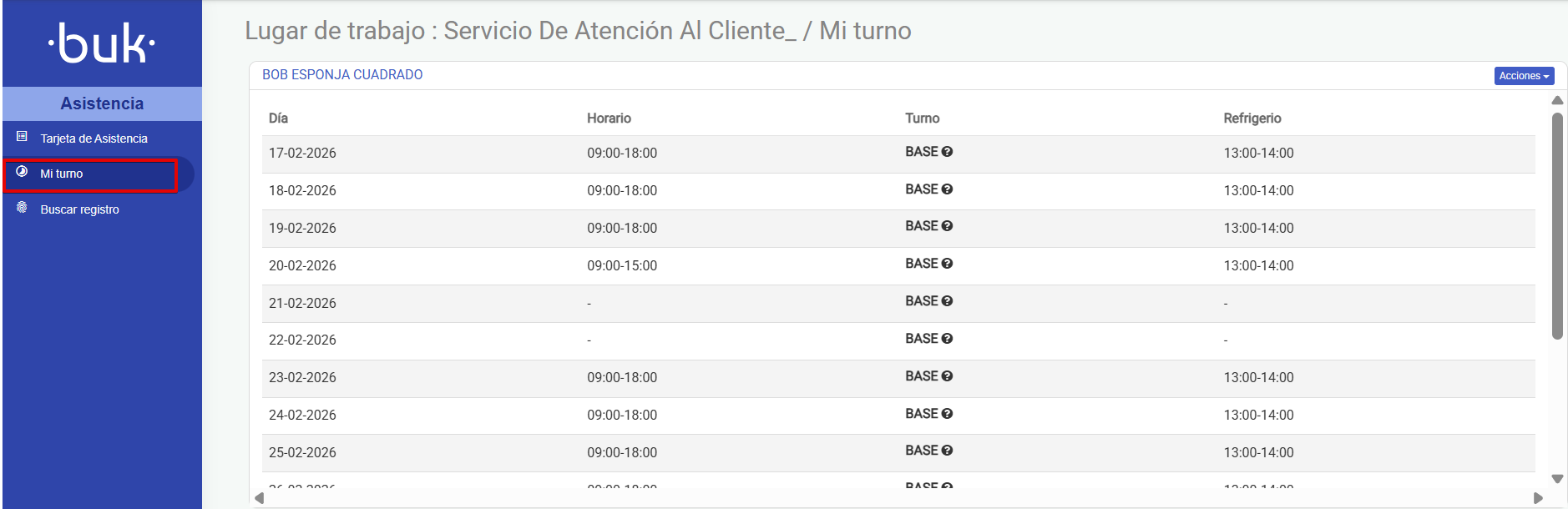 Al seleccionar la sección "Mi turno" el colaborador visualizar su turno asignado en el recinto.
