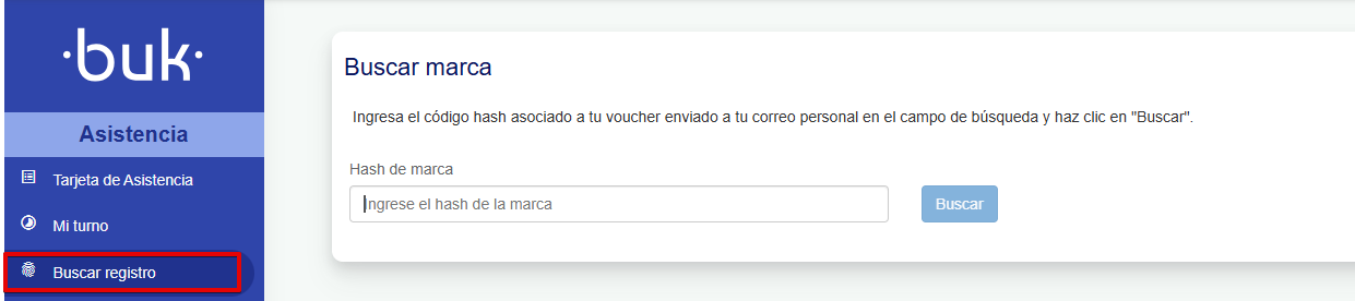 En esta pestaña, el colaborador puede validar su marcación copiando y pegando el código HASH enviado a su correo, siempre que el comprobante de asistencia se encuentre activo.